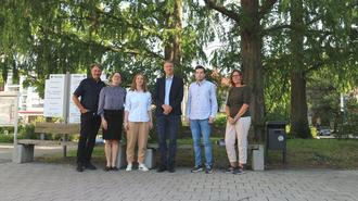 Für ein gemeinsames Bild fand man sich im Schatten der Mammutbäume ein: Bürgermeister Manfred Ockel, Malaika Rahm und Katharina Müller von der NH ProjektStadt/Integrierte Stadtentwicklung, Heiko Körner und Benedikt Sauer von der Hessen Agentur sowie Bettina Weise vom städtischen Bauamt gingen am Dienstag die Teilprojekte des Förderprogramms Klimainsel durch.