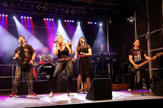 Ebenfalls einen recht kurzen Anfahrtsweg hatten die Musiker der Rüsselsheimer Band Daddy-L, der ihnen zudem noch bestens vertraut sein dürfte, waren sie doch erst in der Vorwoche bei der Kerb zu Gast in Kelsterbach. Bei Daddy-L ist stimmliche Vielfalt Trumpf: Melanie, Wiebke und Chris geben entweder abwechselnd oder gemeinsam als Vokalisten den Ton an. Axel an der Gitarre, Tobi am Bass, Christoph an den Keyboards und Ravi an den Drums komplettieren die musikalisch vielseitige und versierte Rock-Band. Daddy-L haben sich aufs Interpretieren stimmungsvoller, weltweiter Rock- und Pophits der vergangenen Jahrzehnte spezialisiert, die sie bei ihrem Auftritt auf dem Kelsterbacher Altstadtfest kraftvoll, mit viel musikalischem Herzblut und mitreißend darboten. Das vielköpfige Publikum lauschte, klatschte, tanzte und johlte zu den Songs von unter anderem Linkin Park, Guns’n‘Roses, Tina Turner, Don Henley und Falco, denen die Band ihren eigenen musikalischen Stempel aufdrückte. Die aufwendige Lightshow auf der Bühne tat ein Übriges, um den Konzertabend zu einem rundum stimmungsvollen zu machen. Die Bandmitglieder bewiesen dabei eine besondere Kondition, denn erst nach vier Stunden Spielzeit, um 0:30 Uhr, legten sie die Instrumente und Mikrofone schließlich aus der Hand.