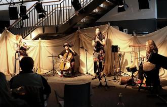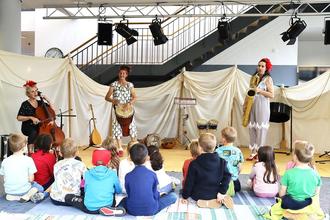 Am vergangenen Mittwoch übernahm das Acht-Ohren-Trio das Lesecafé der Stadt- und Schulbibliothek Kelsterbach. Gemeinsam mit der Musikschule Kelsterbach wurden an diesem Tag zwei Veranstaltungen organisiert. Ein großes Zelt fand hier seinen Platz, besetzt mit zahlreichen Musikinstrumenten. Was es damit auf sich hatte, erfuhren die Zuhörerinnen und Zuhörer bald. Dem Acht-Ohren-Trio bestehend aus Julia Ballin (Saxofone, Geige, Gesang), Sandra Elischer (Perkussion, Gesang) und Anka Hirsch (Cello, Akkordeon, Gesang) gelang es sehr gut die anwesenden Kinder und Erwachsenen mit einzubeziehen.
