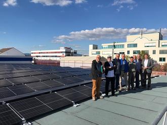 Bürgermeister Manfred Ockel (rechts außen), Martin Klepper (vierter von rechts) und Reinhard Ebert, Vorstand der Bürgerenergie Untermain e.G. (links außen) begutachteten mit den verantwortlichen Beteiligten die neue Photovoltaikanlage.