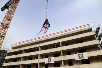 Ockel sagte, er sei überzeugt, dass die Wohnanlage der Stadt eine attraktive städtebauliche Visitenkarte abgebe: „Man sieht schon jetzt, was für ein qualitativ hochwertiges Gebäude hier entsteht.“ Alle Mieterinnen und Mieter könnten sich darauf freuen, dort einzuziehen. Bei so viel lobenden Worten konnte auch der anhaltende Regen die Stimmung nicht trüben. Unter dem Schutz von Schirmen lauschten die Anwesenden dem Richtspruch und beobachteten, wie der an einen Kran befestigte Richtkranz in Richtung Dach gebracht wurde. Mit dieser traditionellen Zeremonie wurde ein wichtiger Schritt in Richtung Fertigstellung des Bauprojekts abgeschlossen. (sb)