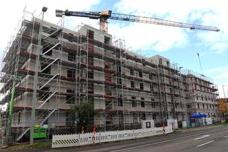 Der Bau von drei mehrgeschossigen Wohngebäuden, die derzeit auf einem ehemaligen Parkplatz entlang des Staudenrings und der Berliner Straße entstehen, geht gut voran. So gut, dass nur knapp fünf Monate nach dem sogenannten „Bodenplattenfest“ am vergangenen Freitag auf der Baustelle das Richtfest gefeiert werden konnte. „Damit liegen wir einen Monat vor dem Zeitplan“, freute sich Turgut Tekin, Leiter der Niederlassung Frankfurt der für den Rohbau zuständigen Firma Implenia. Ulrich Scheinert, Geschäftsführer der BSM Investorengruppe, fügte hinzu, dass dieses Projekt nach einem durch die Pandemie ausgebremsten Start nun richtig vorangetrieben werde, auch wenn die Zeiten für Wohnungsbau sicherlich nicht die Besten seien. Aber allein die Tatsache, dass alle Wohnungen, von denen 20 Sozialwohnungen sein werden, bereits über ein Jahr vor der für Ende 2024 geplanten Fertigstellung vermietet sind, sei ein Zeichen dafür, dass sich die Investition gelohnt habe. Für die 63 Wohnungen mit einer Größe von 60 bis 100 Quadratmetern, die dazugehörige Tiefgarage mit 88 Stellplätzen und zahlreichen Fahrradstellplätzen, sowie fünf Außenstellplätze mit Lademöglichkeiten und den geschützten, teilöffentlichen Innenhof wurde vom Bauherrn, der Konzeptbau Betreuungsgesellschaft mbH, ein Gesamtinvest von 20 Millionen Euro veranschlagt.