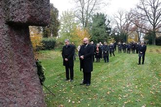 Bürgermeister Manfred Ockel (links) und Stadtverordnetenvorsteher Frank Wiegand (rechts) legten auf dem Ehrenfriedhof Kränze nieder.