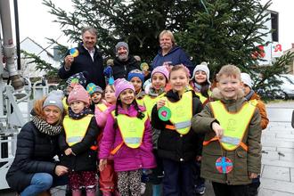 Bürgermeister Manfred Ockel, Kai Jessberger und Thomas Köhlhofer (hinten, von links) freuen sich mit Erzieherin Magda Szydlowska (links) über den tollen Schmuck, den die Kita Kinder (im Bild Kita St. Markus) gebastelt haben.