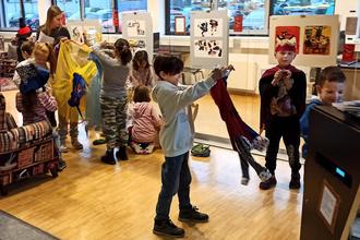 13 Grundschulklassen der Karl-Treutel-Schule und der Bürgermeister-Hardt-Schule hatten sich für Besuche der Ausstellung angemeldet. Die Kinderbibliothek hatte die Schau durch viele Mitmach-Aktionen erweitert. Die Kinder konnten Märchenbücher lesen und hören, sich das Märchen vom „Dicken, fetten Pfannekuchen“ in einem Kamishibai - einem japanischen Papiertheater - ansehen, sich mit Hilfe der Verkleidungskiste in Märchenfiguren verwandeln, an Tischen Märchen-Brettspiele spielen und das Wissen bei einem Quiz erproben. Zum Andenken an den zauberhaften Besuch durfte sich jedes Schulkind aus einer Schatztruhe einen Goldtaler zum Andenken mit nach Hause nehmen. Wegen kurzfristig erforderlicher Baumaßnahmen konnte die Ausstellung lediglich bis Ende November und nicht so lange wie ursprünglich geplant gezeigt werden.