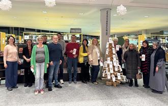Vergangene Woche nutzte die Integrationskommission Kelsterbach ihre Sitzung in der Mensa der Integrierten Gesamtschule die Gelegenheit, um der Stadtbibliothek einen kurzen Besuch abzustatten. Ziel war es, den dort aufgestellten Wunschbaum zu besichtigen, an dem benachteiligte Kinder im Alter bis 14 Jahren ihre Weihnachtswünsche in Höhe von bis zu 20 Euro aufgehängt haben.