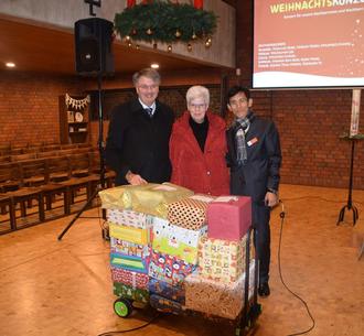Nach langem Applaus und einer Zugabe richtete Pfarrer Man Jong Kim das Wort an das Publikum. Er unterstrich noch einmal, dass die Uri Gemeinde versuche, ihr Bestes für die Nachbarn zu geben. So haben die Gemeindemitglieder in diesem Jahr Geschenke für 100 ukrainische Familien in Kelsterbach gespendet. Symbolisch wurden einige Päckchen von Pfarrer Kim an Bürgermeister Ockel und die städtische Sozialkoordinatorin Agnetha Becker übergeben. „Wir beide bedanken uns ganz herzlich“, so der Bürgermeister. Für Agneta Becker sei das ein ganz besonderer Moment, da sie das ganze Jahr über mit ihrem Team die vielen Flüchtlinge intensiv betreut hat, so Manfred Ockel weiter. Mit Pfarrer Kim werde man nun Termine ausmachen, um die Geschenke persönlich an die Familien zu übergeben. „Das wird bestimmt ein besonderer Moment werden“, so Ockel.