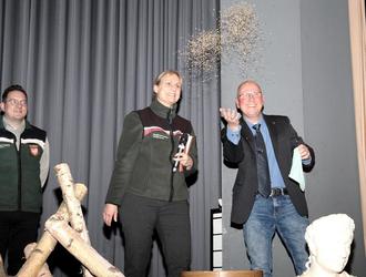 Eine schöne Tradition: Der Austausch der Andreassprüche mit (von links) Revierförster Fabian Müller, Tina Baumann, Leiterin des Stadtforstes Frankfurt, und Christian Schönstein, zweiter Vorsitzender des VBW.
