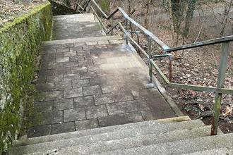 Ende Dezember stürzte ein größerer Baum um, der das Geländer und die Treppenstufen sowie umstehende Bäume beschädigte. Eine Fachfirma hat sich in aufwendiger Seilklettertechnik der Baumschäden angenommen, der KKB hat das Geländer ausgebessert und die beschädigten Treppenstufen repariert. (wö)