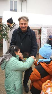 Im Anschluss begab sich Bürgermeister Manfred Ockel auf den Weihnachtsmarkt im Innenhof der Pfarrgasse und schnappte sich den Lostopf, um möglichst viele davon für einen guten Zweck an den Mann und die Frau zu bringen. Aber vor allem die Kinder standen Schlange, um vom Bürgermeister Lose für einen Euro das Stück zu kaufen. Das war kein Wunder, denn es lockten viele tolle Gewinne.