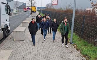 Danach ging es zu Fuß durchs Gebiet, zum Rohbau einer Kita von Terminal-for-Kids und zum Unternehmen Peter Gross Bau, wo Niederlassungsleiter Ingo Ciesielski die Planung eines Neubaus mit Innenhofbegrünung, Photovoltaik-Anlage und gegebenenfalls auch Fassadenbegrünung vorstellte.