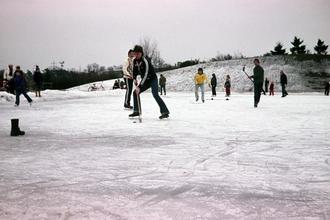 Ein Bild aus einer anderen Zeit, bestehend aus drei Dingen, die es so heute nicht mehr gibt: Als allererstes einen anständigen Winter im Rhein-Main-Gebiet, dann einen Festplatz im Südpark und schließlich die sich darauf befindende Eisbahn. Verantwortlich, zumindest für letzteres, war die Freiwillige Feuerwehr Kelsterbach. Diese spendete das notwendige Wasser und sorgte so dafür, dass manch ein Kufencrack seine Künste zeigen konnte. Das Wasser wurde, ganz simpel, auf den Festplatz gekippt und die Natur erledigte den Rest. Freilich bedurfte es dazu noch einer Umrandung aus Eis, Schnee und ein paar Brettern. Dies wiederum erledigte kurzerhand der Bauhof und fertig war die Eisbahn. Danach konnte man sich, so gut es das eigene Können hergab, auf das Eis wagen und seine Runden drehen. Wie man auf dem Bild aus dem Winter 1979/80 schön sehen kann, dienten zwei Paar Schuhe als Tore für das Eishockeymatch. Wer es nicht so wild mochte, kurvte einfach drum herum.