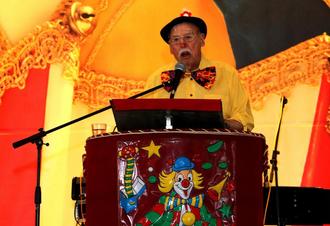 Nach dieser humoristischen Einlage überraschte Volkschor-Mitglied Karl Hasenstab das Publikum mit einer spontanen Darbietung von „Wie liegst Du schön, mein Kelsterbach“. Das stimmgewaltig vorgetragene Lied wurde mit derart viel Applaus bedacht, dass Hasenstab als Zugabe noch das allseits beliebte „In Kelsterbach beim Ebbelwoi“ folgen ließ. Anschließend schaffte es Lothar mit weiteren Stimmungs-Hits einige der gutgelaunten Gäste auf die Tanzfläche zu locken. Es war zu spüren, dass sich die Stimmung zielsicher dem Höhepunkt näherte. Der perfekte Zeitpunkt für die zweite Büttenrede, für die Werner Georg als „Depp“ vors Mikrofon trat. In seinem rund 15-minütigen Beitrag offenbarte Georg, er sei „so blöd, dass es schon weh tun tut.“ Mit seinen gereimten Einblicken ins gemeinsame Shoppen mit der Gattin („aach e blödes Dusseldier“), in seine Versuche, beim Urlaub auf dem Reiterhof auf ein Pferd zu steigen oder in den alltäglichen Wahnsinn des Fernsehprogramms, sorgte der Karnevals-Profi immer wieder für schallendes Gelächter im Bürgersaal.