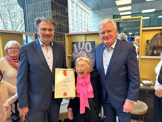 Neben Bürgermeister Ockel (l.) gratulierte auch der ehemalige Fraport-Vorstandsvorsitzende Wilhelm Bender (r.) Margarete Tröndle (Mitte) zu ihrem 100. Geburtstag.