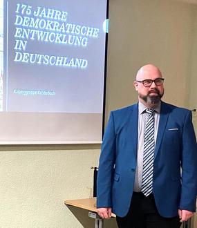 Vor 15 Gästen berichtete zu dem Thema 175 Jahre Demokratische Entwicklung in Deutschland und räumte gleich zu Beginn den Irrtum aus, die demokratische Entwicklung hätte erst mit den Ereignissen rund um die erste deutsche Nationalversammlung in der Frankfurter Paulskirche begonnen. Er schlug im Folgenden einen historischen Schlag von der Mainzer Republik 1793 über die Paulskirche bis zum Parlamentarischen Rat 1948/49 der das Grundgesetz erarbeitete.