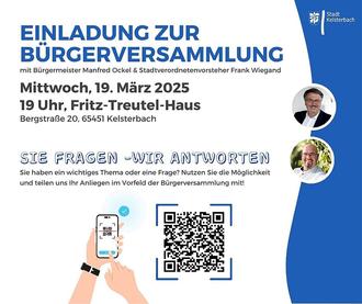 Die Stadt lädt am Mittwoch, 19. März, um 19 Uhr zur nächsten Dialogveranstaltung ins Fritz-Treutel-Haus. Auch bei dieser ersten Bürgerversammlung des Jahres erhalten die Besucher Informationen zu aktuellen Kelsterbacher Themen und haben erneut die Möglichkeit, eigene Themen anzusprechen und Fragen an Stadtverordnetenvorsteher Frank Wiegand sowie Bürgermeister Manfred Ockel zu richten.