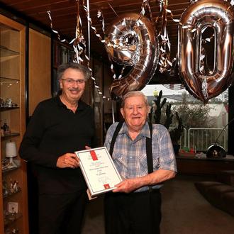 Zum 90. Geburtstag von Heinz Laun kam Bürgermeister Manfred Ockel in die Waldstraße, um dem Jubilar seine persönlichen Glückwünsche auszusprechen und ihm im Namen der Stadt Kelsterbach recht herzlich zu gratulieren. Mit im Gepäck hatte er die Glückwunschurkunden des Landrates Thomas Will und des Hessischen Ministerpräsidenten Boris Rhein.