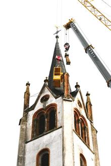 Im Zuge der Instandhaltungsmaßnahmen an der Katholischen Pfarrkirche, die seit dem 17. März stattfinden (siehe RuH Ausgabe 11/2025), wurde festgestellt, dass eines der kleinen Filialtürmchen, die den Kirchturm der Martinuskirche zieren, einsturzgefährdet ist und abgenommen werden muss. Um das zu bewerkstelligen, musste am vergangenen Freitag Mittag ein zweiter Kran anrücken. Ein Arbeiter wurde mit Hilfe des schon aufgebauten Kranes in einer Kabine in luftige Höhe gezogen, damit er vor Ort das Bauwerksteil befestigen und an den zweiten Kran anhängen konnte. Letzterer lies dann das Tonnen schwere und mannshohe Teil langsam zu Boden gleiten. Zum Glück handelt es sich nur um die Spitze des Türmchens. Trotzdem wird dies, so Dekan Christian Heinz, natürlich ein wenig das Erscheinungsbild verändern, da es sich um das vordere rechte Türmchen handelt. Die anderen drei Ziertürmchen am Kirchturm sind aber in gutem Zustand und bleiben. Die Firma Petto wird im Zuge der Dachsanierung den „Türmchentorso“ mit einer Dachhaube gegen weitere Witterungseinflüsse absichern. (BäR)