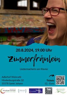 Die junge Liedermacherin Zimmerfräulein aka Maria Zimmermann aus Rostock begeistert mit ihren Texten und Melodien am Klavier. Ehrliche Texte, die aus dem wahren Leben erzählen – geprägt von Hoffnung, Freude und Leichtigkeit, die aber auch Abschied, Verlust und Leid thematisieren. Gleichzeitig erschafft sie durch die Mischung aus eigenen und Coversongs – unter anderem von Alicia Keys, Damien Rice über Beth Hart und London Grammar – eine rundum gemütliche Atmosphäre. Weiterhin gehören Größen, wie Aretha Franklin, Whitney Houston, Reamonn, U2, Boy, Bob Dylan und Bosse, zu ihrem Repertoire.