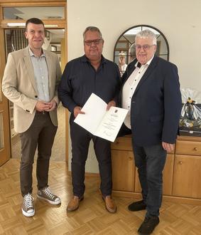 1985 begann seine Ausbildung im mittleren Dienst beim Postamt Bad Kreuznach. Dann folgte der Wehrdienst bei der Marine in Flensburg und anschließend das duale Studium im gehobenen Dienst bei der VG Langenlonsheim. Nach erfolgreichem Abschluss 1994 war Jens Wagner bis Anfang 1996 bei der VG Rheinböllen in der Finanzabteilung. Im Februar 1996 avancierte er zum stellvertretenden Abteilungsleiter Finanzen in die VG Sprendlingen-Gensingen, wo er drei Jahre später zum Verbandsgemeindeinspektor ernannt wurde. 2003 erfolgte die Ernennung zum VG-Amtmann, 2004 bis 2006 das Studium zum Diplom Verwaltungs- und Betriebswirt in Koblenz. Im Jahr 2009 erhielt Jens Wagner die kommissarische Leitung der Finanzverwaltung Sprendlingen-Gensingen bis hin zur Leitung des FB 3 als Nachfolger von Gerhard Matzke im Jahr 2010. Im Jahr darauf folgte die Ernennung zum Amtsrat und 2017 die Ernennung zum Verbandsgemeindeverwaltungsrat. Und heute, am 01.10.2025, feiert Jens Wagner sein 40jähriges Jubiläum im Öffentlichen Dienst. Gratulationen auch von Büroleiter Benjamin Hilger, vom Personalrat und allen Kolleginnen und Kollegen seines Fachbereiches. Herzlichen Glückwunsch!