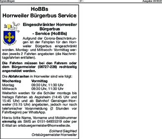 Aufgrund der Corona-Beschränkungen ist der Fahrplan für den Horrweiler Bürgerbus eingeschränkt worden. Montag- und Mittwoch-Vormittag werden jeweils 2 Fahrten angeboten (die Nachmittagsfahrten entfallen). Die Fahrten müssen bei den Fahrern oder dem Bürgermeister (06727-226) rechtzeitig angemeldet werden.