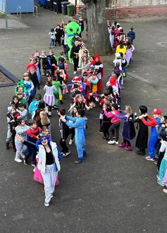 Und so verwandelte sich am 28.02.2025 unsere Schule zu einer närrischen Arena. Alle Schülerinnen und Schüler, sowie das Team der Prof. Jakob Muth Grundschule durften verkleidet zum Unterricht kommen. Nach einem leckeren Frühstück im Klassenverbund startete eine lange Polonaise aus Kindern und Lehrkräften durch das komplette Schulgelände.