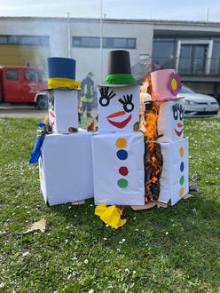 Das Verbrennen der Schneemann-Familie, um symbolisch den Winter zu vertreiben, fand im Anschluss gemeinsam vor der Kindertagesstätte am Kastanienbaum mit der ortsansässigen Feuerwehr als Brandwache statt.
