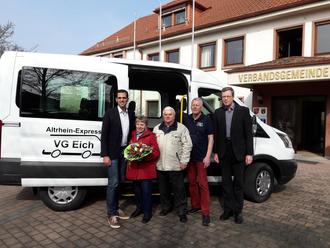 Die erste Fahrt des Bürgerbusses 2017 mit VG Bürgermeister Abstein, Ehepaar Oswald, Gimbsheim, Teamleiter Krebs und RLP-Initiator Bürgerbus Dr. Jansen