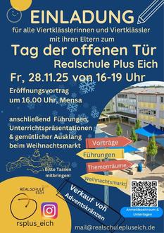Die Realschule Plus Eich lädt herzlich zum Tag der offenen Tür am Freitagnachmittag, dem 28.11.2025, von 16:00 Uhr – 19:00 Uhr ein. Eltern und Schülerinnen und Schüler der Klassenstufe 4 können sich an diesem Tag umfassend über die weiterführende Schule informieren und den Weihnachtsmarkt unserer Realschule Plus Eich besuchen.