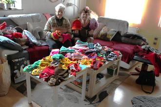 Irmgard Gille vom AWO-Markthausteam beim Abholen der von Maria Gröhl voller Leidenschaft im "Akkord" angefertigten Stricksachen für Kinder in Not.