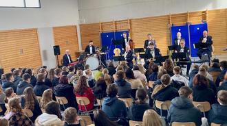 Letzten Mittwoch kam die Combo des Landespolizeiorchesters Rheinland-Pfalz zu einem Konzert in der Turnhalle in Eich, das die Themenwochen zum Jazz abschloss. Unter dem Titel "Kornett statt Knarre" präsentierten sie ein Programm, das die Entstehung des Jazz in New Orleans im frühen 20. Jahrhundert beleuchtete. Sie erzählten spannend von den historischen und musikalischen Bedingungen, unter denen Louis "Satchmo" Armstrong aufwuchs.