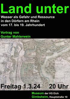 Am Freitag, 1.3. 20 Uhr hält Gunter Mahlerwein den Vortrag "Land unter. Wasser als Gefahr und Ressource in den Dörfern am Rhein im 17. bis 19.Jahrhundert." Dabei wird es darum gehen, wie sehr Wasser das Leben der Dorfbewohner in den vergangenen Jahrhunderten bestimmt hat und wie es die Dörfer geprägt hat. Es wird einen Blick zurück geben in die Zeit vor der Rheinbegradigung, in der große Teile der Gemarkungen häufig unter Wasser standen, die Folgen der Rheinbegradigung für die landwirtschaftliche Nutzung und die Auswirkungen des großen Jahrhunderthochwassers 1882/83 auf die Region werden weitere Themen des Vortrags sein. Der Eintritt ist frei.