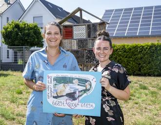 Platz 3 im Fan-Ranking erreichte mit 1741 Stimmen die Domholzschule Limburgerhof. Der Schulelternbeirat und die Schulleitung haben ein Konzept zur Umgestaltung des Schulhofes entwickelt. Kinder können hier Freundschaften knüpfen, ihre Fantasien entfalten und sich an der frischen Luft bewegen. Im Bild übergibt Annika Jester von der Thüga Energie (rechts) den Spenden-Scheck an Patricia Zeller vom Schulelterbeirat.