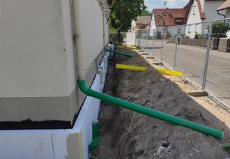 Das Verbessern der energetischen Werte steht derzeit im Mittelpunkt der Sanierungsarbeiten an der Turnhalle der Carl Bosch-Schule. Zur Dämmung der Außenhülle gehört auch das Aufgraben des Sockels entlang der Waldgasse (Bild). Er wird von außen abgedichtet und ein Wärmedämm-/Verbundsystem aufgeklebt. Die neuen Fenster sind schon installiert.