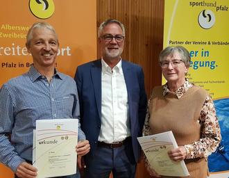 Am 30.09.2022 ehrte der Sportbund Pfalz unter der Leitung seines Präsidenten Rudolf Storck (Bildmitte) und der Verantwortlichen für das Deutsche Sportabzeichen Kornelia Schmidt Vereine und Schulen der Pfalz für besondere Leistungen beim Deutschen Sportabzeichen 2021. Hierzu eingeladen war auch die TG 04 Limburgerhof. Stellvertretend für den Vorstand der TG 04 fuhren Magdalena Seifert (rechts) und Uwe Weber (links) zum Haus der Nachhaltigkeit bei Johanniskreuz.