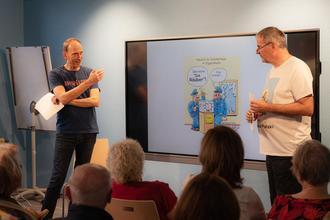 Das Motto „Uffbasse - Alles im Blick – von Schockanruf bis Enkeltrick!“ lockte nun erneut (auch an einem Freitag, dem 13.) zahlreiche Besucherinnen und Besucher in die Gemeindebücherei. Die Veranstalter konnten vermelden „Alle Plätze belegt“. Das Publikum löste gemeinsam mit „Kommissar Palzki“, humorvoll gelesen von Harald Schneider (im Bild rechts) und Steffen Boiselle (links) – dem bekanntesten Pfälzer Cartoonisten -, knifflige Ratekrimis zu Telefonbetrug, Taschendiebstahl, Haustürkriminalität und Datenklau.