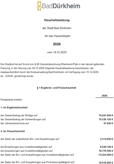Der Haushaltsplan 2026 liegt zur Einsichtnahme von Freitag, den 19.12.2025 bis einschließlich Donnerstag, den 08.01.2026, während der allgemeinen Öffnungszeiten im Rathaus, Mannheimer Str. 24, Zimmer 1.17, öffentlich aus. Alternativ kann der Haushaltsplan auf der Homepage der Stadt Bad Dürkheim eingesehen werden.