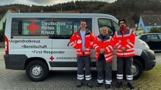 Die ehrenamtlichen Aktiven Helfer im Deutschen Roten Kreuz durchlaufen eine mehrstufige Ausbildung, damit sie in den verschiedenen Gemeinschaften ihre verantwortungsvolle Aufgaben durchführen können. Basis ist die Grundausbildung, welche ihrerseits aus mehreren Modulen besteht. Der Ortsverein Hochspeyer gratuliert den beiden Aktiven Jonathan Lee Wagner und Karol Gooß zum erfolgreichen Abschluss dieser Ausbildungsstufe. Das Bild zeigt die beiden Sanitätshelfer zusammen mit dem Kreisbereitschaftsleiter Roland Kiefaber vom DRK Kreisverband Kaiserslautern-Land, welchem der Ortsverein angehört.