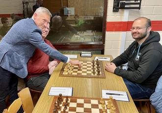 Mit leichter Verspätung, aber dennoch persönlich anwesend (wie immer), eröffnete Landrat Ralf Leßmeister den 36. Landratspokal in der Sporthalle Fischbach. Das kleine Traditionsturnier hat in der Region einen hohen Stellenwert. So konnte der SV Fischbach, der diesmal durch seine Freunde aus Enkenbach bei der Organisation unterstützt wird, nochmals 24 Spieler willkommen heißen. Darunter auch Stars wie Oleg Yakovenko aus Kaiserslautern, der im Bild rechts als Schwarzspieler gegen Torsten Friedrichs aus Enkenbach ran musste. Ralf Leßmeister gab als symbolischen Zug 1.e2-e4 vor, aber Torsten nahm das lieber wieder zurück und korrigierte auf 1.d2-d4. Auch wenn unser Schachfreund Torsten lange wacker kämpfte, zog er am Ende den Kürzeren, Oleg war einfach zu stark.