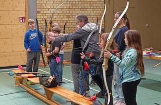 Neun Kinder und Jugendliche durften über zwei Stunden ihr Können testen. Die Halle war so präpariert, dass Pfeile, die ihr Ziel verfehlten, von einem Vorhang aufgefangen wurden. Die Schützen, die noch nie einen Bogen in der Hand hielten, hatten jede Menge Spaß.