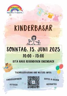 Am 15. Juni findet von 10 bis 13:00 Uhr der Kinderbasar des Fördervereins Kita Haus Regenbogen e.V. auf dem Gelände der Kita in Enkenbach statt.