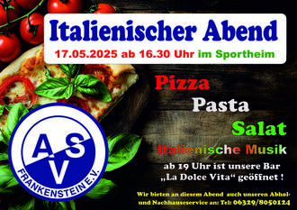 Am 17. Mai ab 16:30 Uhr laden wir Sie zu einem geselligen Abend bei italienischen Klängen ein. Genießen Sie unser Angebot der landestypischen Speisen wie Salat, Pizza und Pasta.
