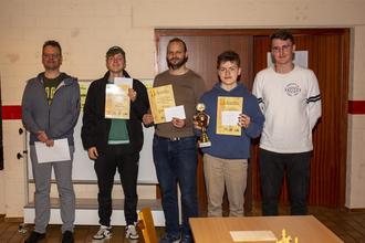 Der schöne Abend ging mit einer gelungenen Siegerehrung zu Ende. Joachim las die Gewinner vor und Markus Fauss verteilte die Preise. In der Kathegorie U18 gewann Tristan Klein (3. Punkte) vor Cassian Trenkelbach (2,5 Punkte) und Silas Trenkelbach (1 Punkt).