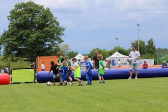 Unser Spielefest kam bei den ansässigen Anwohnern und angereisten Gästen gut an. Die Kinder hatten bei erst heißen Temperaturen die Möglichkeit, sich in der Wasserhüpfburg abzukühlen. Die Mehrheit begab sich jedoch erstmal an den Ball. Spiele im Kleinfeld mit den Bubble Balls oder in der angelieferten Air Pitch Arena im 3 vs 3 bzw. 4 vs 4 oder im Lebendkicker konnten die Kids, aber auch jung und alt, sich für den Fußball begeistern und erste Erfahrungen sammeln. Angeboten wurden warme Speisen, kalte Getränke, aber auch angeliefertes frisches Obst (Bürgermeisterin Silke B. überreichte die Spende).