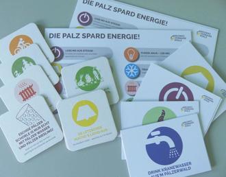 Energiespar- und Klimatipps auf Pfälzisch: Postkarten, Bierdeckel und Flyer des Bezirksverbands Pfalz