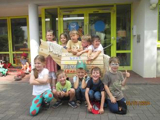 Am 27.07.24 wurden wir von unseren Vorschulkindern und Eltern überrascht. Zum Abschied haben wir ein großes Aufsteig-Holzpferd für den Außenbereich bekommen.
