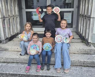 Leia, Mina, Silas, Maja und Mason zeigen stolz ihre Keramikkunst