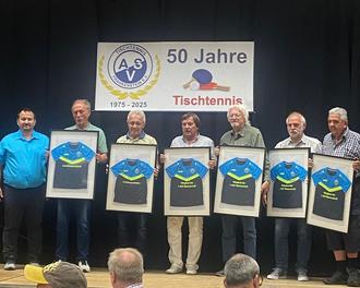 Der Verein ließ sich für die drei noch lebenden Gründer, Hans-Günter Weilacher, Udo Täffler und Günter Burkhardt (er musste leider früher gehen), sowie für die weiteren Mitglieder der 1. Herrenmannschaft aus dem Jahr 1976, Karlheinz Christmann, Ralf Eichert, Horst Nabinger und Werner Schuler, etwas Besonderes einfallen. Der 1. Vorsitzende überreichte das neue Jubiläumstrikot der Abteilung in Minigröße, „gerahmt“ als Andenken an Ihre ASV-Zeit!