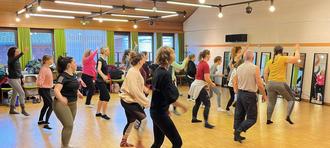 die zahlreichen Tänzer*innen üben sich vor der improvisierten Spiegelwand an den gezeigten Schrittfolgen