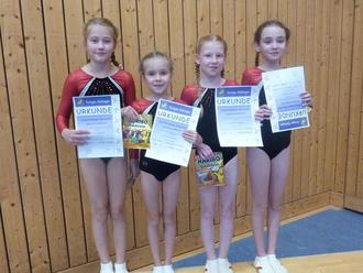 Am gleichen Tag fanden auch die Gaubestenkämpfe Mannschaft statt. Hier waren wir mit 2 Mannschaften vertreten. Im großen Teilnehmerfeld schafften Theresa Spies, Aliyah Deubert, Lena Ossowski und Lisa Buchner im Jahrgang 2008 und jünger einen tollen 5.Platz mit 150,50 Punkten. Die Mannschaft im Jahrgang 2012 und jünger belegte mit Anastasia Schendel, Amelie Merz, Sarah Harder und Eliana Meier einen guten 6.Platz mit 143,90 Punkten. Herzlichen Glückwunsch!